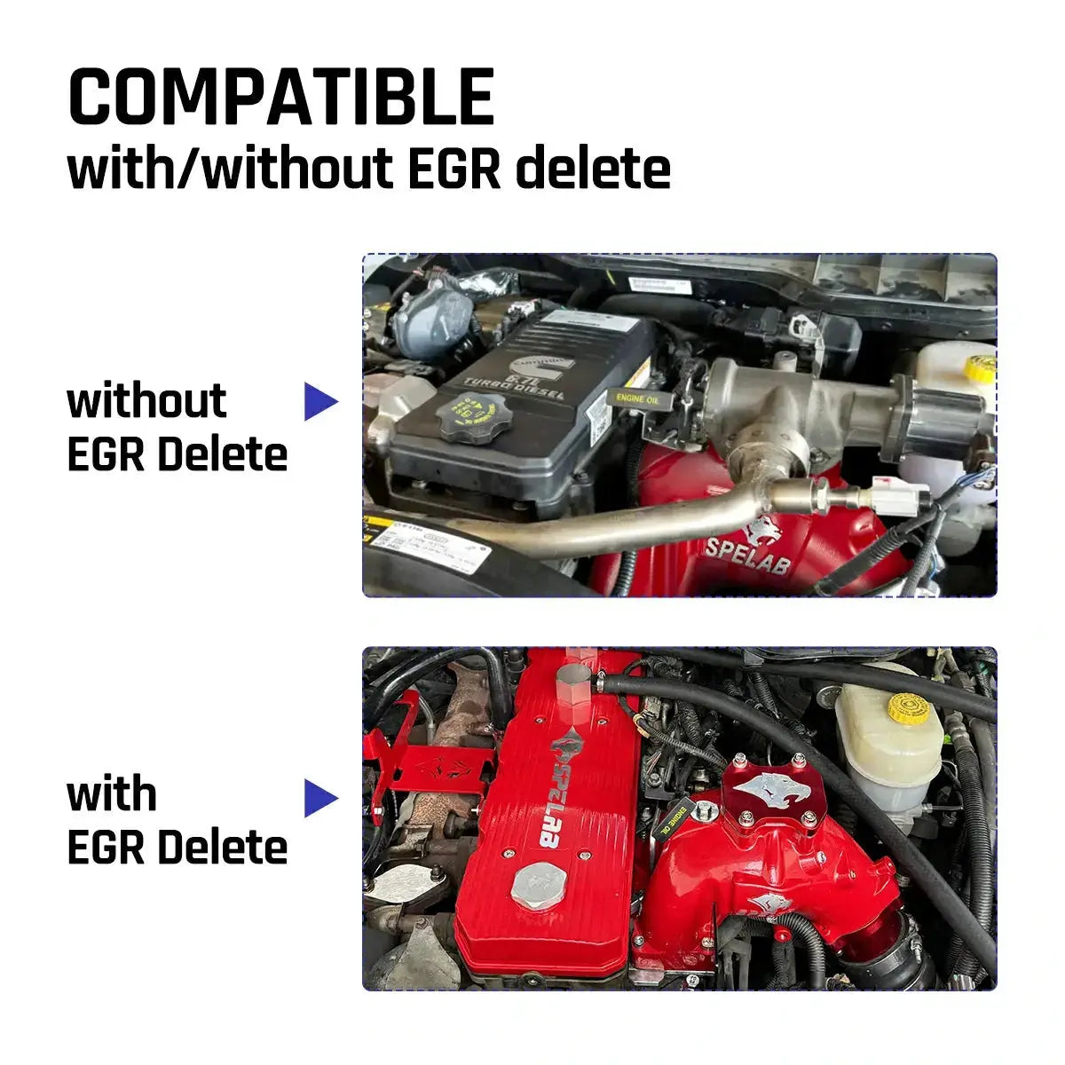 The SPELAB 6.7L Dodge Ram Intake Manifold/Horn enhances performance for 2007-2024 6.7L Dodge Ram engines with improved airflow and durability. Compatible with our EGR Delete Kit, it offers easy installation and performance whether or not the EGR is deleted. Designed with heating element provisions, you can seal the ports in warm weather or install them in colder conditions. Available in black, silver, and red, it delivers reliable performance and customization for your engine.