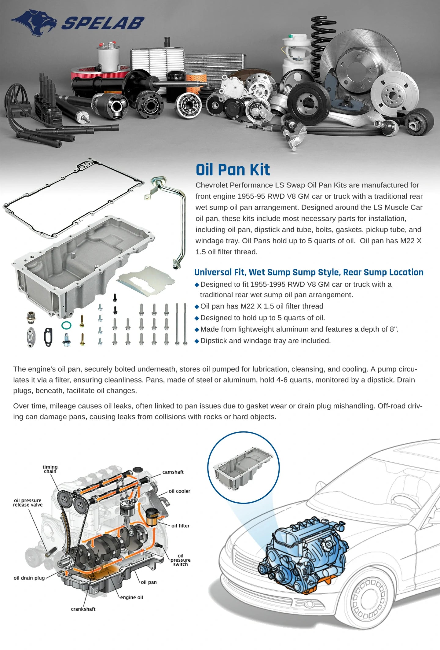 Composed of lightweight cast aluminum, SPELAB's low-profile, retro-fit oil pan is designed to allow for increased clearance to the ground and chassis. It will fit many GM rear-wheel drive applications originally equipped with a small or big block Chevy engine and factory rear sump pan.